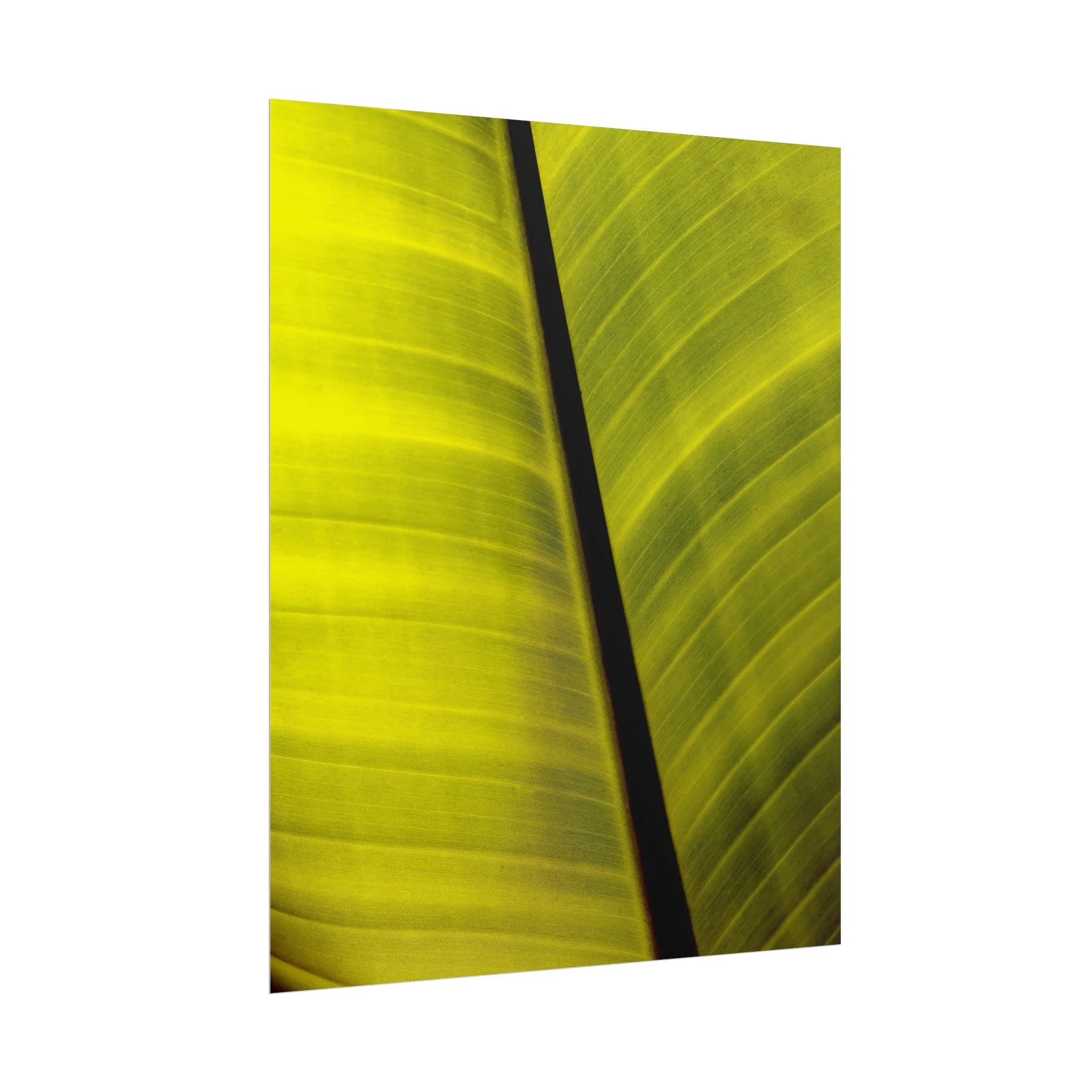 Backlit by a strong light source, the leaf becomes a glowing, translucent grid of lime and emerald. It’s a piece that sits at the intersection of botanical photography and abstract art. Ideal for modern, high-contrast spaces that value clean lines and organic energy.