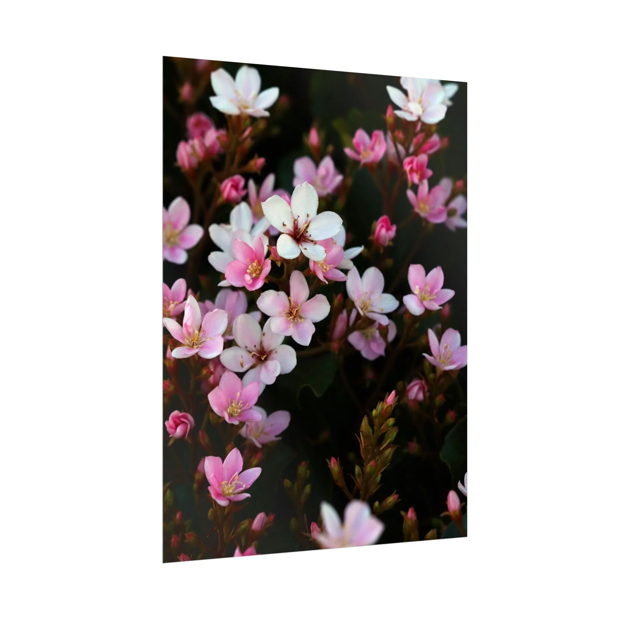 Soft pink blooms glow against deep, moody foliage — a gentle, intimate scene that settles any room. Choose textured fine art paper for a painterly, archival feel; pick semi-glossy for vivid, photographic color; or go matte when you want a softer, low-reflective finish. Available in multiple sizes and orientations so it can slide into a narrow hallway, sit above a bedside table, or anchor a gallery wall. Shipped rolled to protect the paper and let you choose the perfect frame or hanger once it arrives.